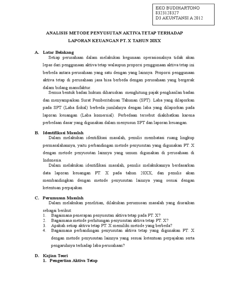 Analisis Perhitungan Penyusutan Aktiva Tetap Menurut Standar Akuntansi Keuangan Dan Peraturan Perpajakan Serta Pengaruhnya Terhadap Laporan Keuangan Pada Pt Nitigura Indonesia Universitas Islam Negeri Sultan Syarif Kasim Riau Repository from repository.uin-suska.ac.id Laporan keuangan menyediakan berbagai informasi penting yang dapat digunakan untuk membuat 4. Nilai aktiva tetap akan menjadi berkurang karena adanya pemakaian aktiva tetap tersebut sehingga dalam akuntansi dikenal dengan penyusutan aktiva tetap. Laporan keuangan merupakan informasi mengenai keuangan sebuah perusahaan yang dapat digunakan untuk melihat bagaimana kinerja perusahaan tersebut dalam suatu periode tertentu. Aktiva dimasukkan dalam neraca dengan saldo normal debit. Pada aktiva tetap akan terus dihitung biaya penyusutan dengan tujuan sebagai pengganti hingga umur ekonomisnya berakhir. Dalam hal ini, yang dimaksud dengan perusahaan jasa adalah perusahaan yang bergerak khusus menangani atau memberikan layanan di bidang penjualan jasa atau keahlian. Dalam bidang akuntansi dan manajemen, membuat laporan keuangan merupakan hal yang umum. Jadi begini, di dalam laporan keuangan ada yang namanya laporan arus kas.